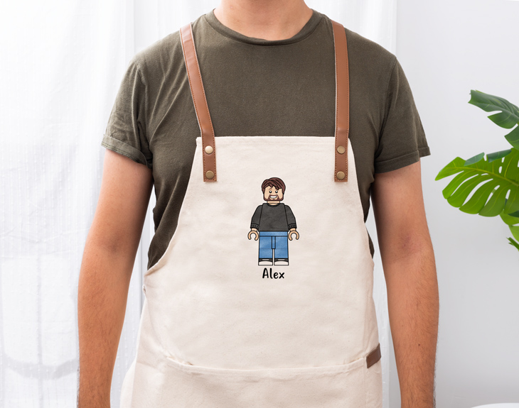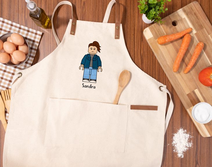 Si eres esa persona que le encanta pasar tiempo en la cocina y hacer las mejores recetas del mundo, necesitas tener este delantal vintage personalizado. Es el regalo perfecto para esa persona que se pasa el día en la cocina, experimentando platos y haciendo sus comidas más ricas para cualquier evento o celebración. Seguro que le encantará tener un delantal personalizado con sus propios muñecos Lego. ¡Será su compañero perfecto para pasar las horas entre fogones! Si quieres sorprender a esa persona que cocina como los dioses, hazlo con este original delantal. Es el intercambio perfecto: tú le regalas este accesorio tan guay y esa persona te hace tu comida favorita. ¡Es genial! Pero no es un delantal cualquiera porque incluye pequeños detalles que lo hacen único. Es de color beige y parte de sus tirantes están recubiertos de polipiel marrón, lo que hace una combinación perfecta. Podrás atarlo de manera muy original, como ves en la imagen, por la parte de atrás para que quede perfecto y se adapte a cualquier persona. Pero es que además, en la parte delantera cuenta con un amplio bolsillo para guardar lo que quieras. ¡Lo tiene todo! Si quieres saber cómo puedes personalizar este delantal vintage sigue leyendo porque es muy sencillo. Añade el producto al carrito y entra en el área de personalización. Ahí, podrás crear desde cero y elegir cuántos muñecos Lego quieres poner en el delantal. También, podrás añadir un nombre debajo de cada personaje y listo. Será el mejor regalo del mundo para esa persona que ama la cocina. ¡No se lo querrá quitar nunca! Importante: a partir de 6 personajes irán distribuidos en dos filas. Es decir: - Familia de 6 personajes: 3 en la fila superior, y 3 en la inferior. - Familia de 7 personajes: 4 en la fila superior, y 3 en la inferior. - Familia de 8 personajes: 4 en la fila superior, y 4 en la inferior. Dimensiones: 75 x 65 cm (aprox). Material: 100% algodón. Cintas de cuello y cintura de algodón decoradas (en algunas zonas) con polipiel marrón y remaches metálicos.