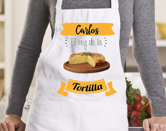 La tortilla española es la especialidad de nuestro país. Si conoces a alguien que la elabore especialmente buena, aquí tienes el regalo original perfecto para él. En ocasiones, es conveniente premiar a las personas que crees que lo están haciendo bien. Este delantal "El rey/reina de la Tortilla es una buena opción para empezar. ¡Dale alegría a la vida y disfruta con los pequeños detalles! -Medidas aproximadas Delantal de colores: 89x65 cm Delantal blanco: 84x57 cm -Medidas aproximadas de la cinta del delantal con foto blanco: 60 cm cada tira. Material: 100% poliéster.