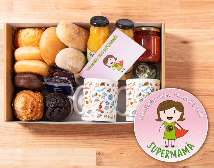 Contenido para 1 persona: • Caja. • Taza blanca (personalízala por 5€). • Manzana roja. • Café. • Té de varios sabores. • Zumo ecológico. • Bollería Artesanal: -Coulant de chocolate (artesanal). -Muffins con pepitas. (artesanal). -Donuts. -Mini Donuts. • Talonario con vales para súper mamás. • Servilleta. • Tarjeta Recordatoria. Contenido para 2 personas: • Caja (personalizada o sin personalizar). • 2 Tazas blancas (personaliza cada una por 5€). • 2 Cafés. • Té de varios sabores. • 2 Zumos ecológico (Huerto de Sabor). • Bollería Artesanal: -Coulant de chocolate (artesanal). -Muffins con pepitas. (artesanal). -Donuts (Pan Rico). -Mini Donuts (Pan Rico). • Panes artesanales: - Pan chapata - Pan de cristal. - Pan brioche. • Tomate rosa de Barbastro triturado (300g). • 2 Aceites de oliva ecológicos 10 ml. • 2 cuberterías. • 2 servilletas. • Talonario con vales para súper mamás. • Tarjeta Recordatoria. Las tazas y los termos personalizados reemplazarán a los del desayuno. ¿Cómo incluir los productos opcionales? Una vez hayas seleccionado el tipo de desayuno, en el apartado de adicionales (paso 2) podrás añadir todos los productos opcionales que quieras.