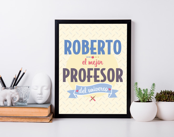 Si este año habéis tenido al mejor profe y queréis sorprenderle, esta lámina personalizada es la opción perfecta. Las láminas son una original forma de darle las gracias a vuestro profe `por todo lo que os ha enseñado. Además es una forma divertida de hacerle saber que valoráis todo su esfuerzo y trabajo. Para personalizar esta lámina simplemente tenéis que decirnos el nombre de vuestro profe y nosotros nos encargaremos del resto. Estamos convencidos de que le encantará y la lámina pasará a ser el centro de atención de la clase. ¿Se os ocurre una idea mejor? Tienes dos tamaños de lámina para elegir. Importante: El color del marco puede variar según stock.