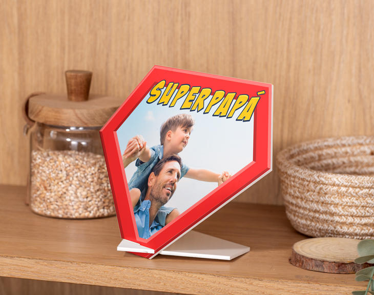 ¿Tienes la suerte de vivir con un verdadero superhéroe? Sí, ese al que todos los días llamamos papá. Y para hacerlo oficial, tenemos el regalo perfecto para él: un escudo personalizado flotante con vuestra foto favorita. ¡Es la forma más especial de reconocer su título de Super Papá! Este Día del Padre, no dejes pasar la oportunidad de demostrarle cuánto lo quieres. Con este original escudo, ¡seguro que triunfarás! Al recibirlo, será una mezcla de emoción y ternura como nunca antes. ¡Le encantará tener un detalle tan único y personal! Es un original adorno fabricado en metacrilato blanco, con un grosor de 3 milímetros, este escudo consta de dos piezas: una más grande, donde se imprimirá tu imagen, y otra más pequeña que actuará como peana para el escudo central. Al recibirlo, solo tendrás que colocar la peana en la base del escudo a la altura que desees y escoger junto a papá el rincón perfecto de tu hogar. ¿Cómo personalizarlo? Es muy fácil. Añade el producto al carrito y entra en el área de personalización. Allí escoge el diseño que prefieras y sube vuestra foto favorita. Ajusta la imagen como desees y listo. Tendrás un regalo original para papá. Tamaño escudo: 21,9 x 16,7 cm. Tamaño peana escudo: 12,9 x 10,6 cm.