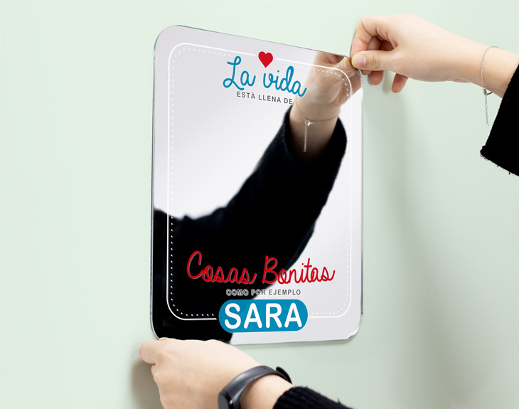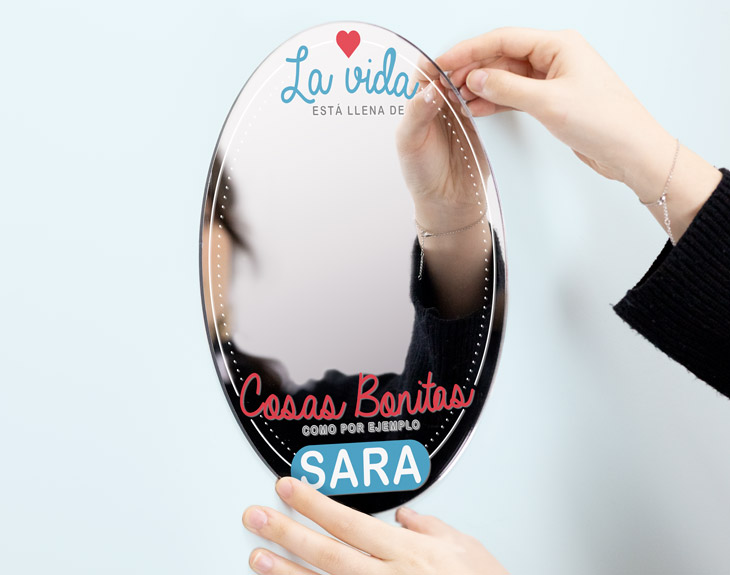 No hay nada mejor que empezar la mañana mirándote en un fantástico espejo personalizado con tu nombre y que te diga cosas bonitas. A todo el mundo le gusta algo así, por eso estás ante un regalo estupendo. Es tan fácil como elegir el tipo de espejo que quieres regalar, decirnos el nombre de la persona... ¡y listo! Recibirás un espejo personalizado con el que sorprender a esa persona especial. El espejo está disponible en tres formas: - Ovalado: 24 x 29 cm. - Rectangular: 32 x 27 cm. - Corazón: 32 x 28 cm. Nuestros espejos están fabricados en metacrilato, con lo cual son más ligeros que un espejo de vidrio. Podrás fijarlos en prácticamente cualquier superficie con unas sencillas tiras de cinta adhesiva de doble cara.