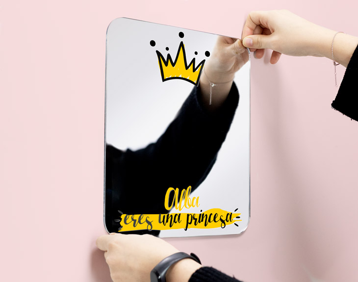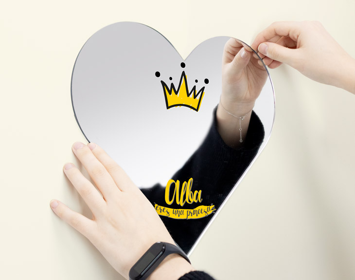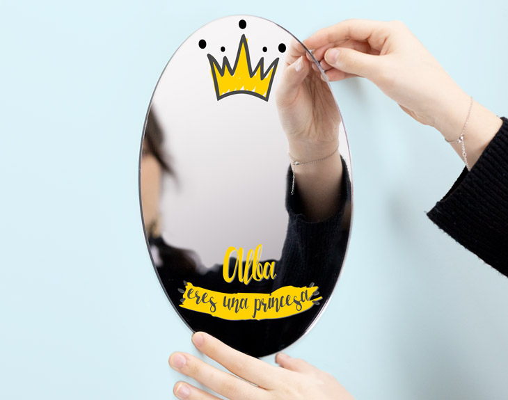 El espejo personalizado perfecto para sorprender a la princesa de la casa. Y es que, si quieres que cada día al mirarse al espejo vea toda esa luz que desprende y que todos véis en ella, este regalo original está hecho para ella. Solamente tienes que decirnos su nombre y nosotros nos encargamos de insertarlo en este diseño tan emotivo. Y es que, a las princesas hay que quererlas y mimarlas como se merecen. ¿Y qué mejor que empezar a hacerlo con un detallazo como este? - Ovalado: 24 x 29 cm. - Rectangular: 32 x 27 cm. - Corazón: 32 x 28 cm. Nuestros espejos están fabricados en metacrilato, con lo cual son más ligeros que un espejo de vidrio. Podrás fijarlos en prácticamente cualquier superficie con unas sencillas tiras de cinta adhesiva de doble cara.