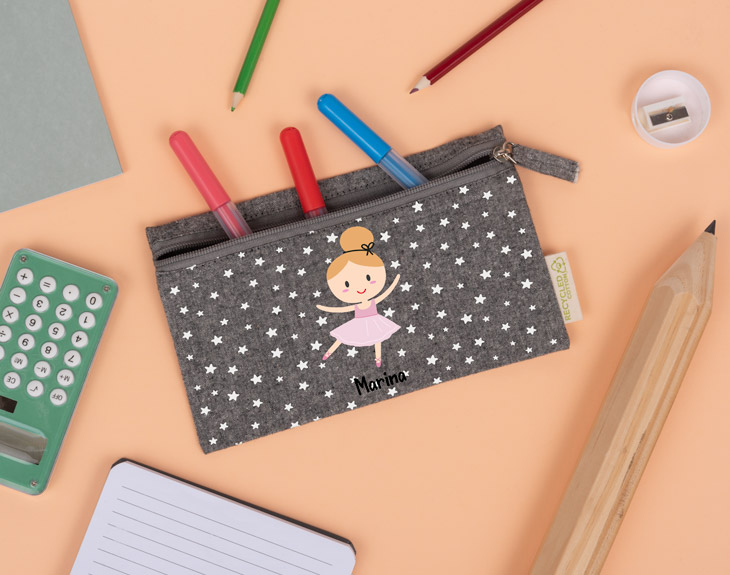 Este nuevo curso, tus hijos van a aprender muchas cosas: matemáticas, ciencias naturales, ballet... ¿Por qué no enseñarles también a cuidar el medio ambiente de una manera práctica en lugar de con tanta teoría? En su día a día podrán ver que es factible vivir de manera responsable y seguir disfrutando de lo mejor. ¡Ya verás como les encanta este estuche de algodón reciclado personalizado! De hecho, su suave tela de varios colores a elegir ocupa menos espacio que un estuche de plástico tradicional. Tan sostenible como bonito, este estuche de colores con nombre y diseño está pensado para esa pequeña bailarina que sueña con triunfar en 'El lago de los Cisnes'. Anímala a perseguir su sueño cuando más lo necesite: estudiando en clase o en casa. En todos esos lugares, podrá tener su nombre escrito junto a este monísimo personaje sobre su propio estuche rectangular. ¡Nadie tendrá uno como el suyo! Las actividades extraescolares son de lo que más anima a los alumnos, así que este puede ser un muy necesario regalo original para la vuelta al cole. Con cremallera incluida y etiqueta de sostenibilidad garantizada. Material: algodón reciclado. Medidas: 21x12,5 cm.