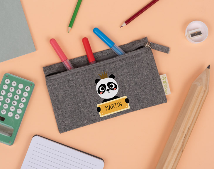 Te presentamos al nuevo compañero de clase de tu hijo/a. Y sí: ¡es un animal! Si el pequeño/a es fan de los pandas (que seguro que sí si nunca los ha visto), le encantará que sea uno de esta especie quien sujete un cartel con su nombre escrito. Este será el diseño que tenga sobre este estuche de algodón reciclado personalizado. Un osito de este estilo es infalible para sacarle una sonrisa a pesar de los madrugones para ir a clase. ¡Merece la pena por ello! Por si no fuera suficientemente mono el osito panda con la gorra, ¡también incluye un cartel a personalizar! Sobre él, puedes hacer que venga tu estuche infantil de colores con nombre y diseño. Sea el texto que sea, puedes escribirlo desde nuestro personalizador una vez añades el producto al carrito. En vez de su nombre, puedes añadir la asignatura para la que va a utilizar todos los lápices de colores y rotuladores que caben en su interior. No le falta un detalle a este regalo original para la vuelta al cole. Además de bonito y sostenible, también es muy práctico gracias a sus estiradas dimensiones y su tela sostenible disponible en varios colores. Material: algodón reciclado. Medidas: 21x12,5 cm.