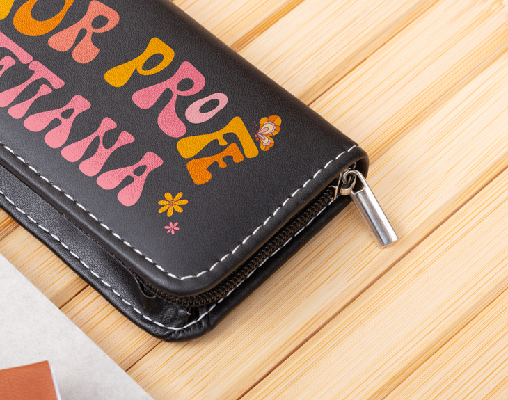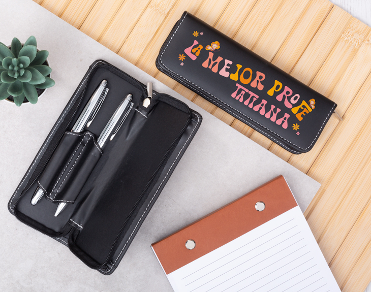 Sabemos que una de las tareas más aburridas de ser profe es tener que corregir durante todo el año muuuuchos exámenes. Por eso, ahora que se acerca el fin de curso, es el momento perfecto para sorprenderle con un regalo único: ¡su propio estuche personalizado con bolígrafos! Este accesorio se convertirá en su mejor aliado para el próximo curso y además el mensaje que tiene en la tapa de este estuche le emocionará cada vez que lo lea. Si quieres sorprender a tu profe favorito, hazlo con este original regalo hecho especialmente para los mejores maestros y maestras del mundo. ¿A quién no le gustaría tener un estuche tan elegante personalizado con su nombre? Cuando reciba este detallito seguro que se quedará sin palabras y además estará deseando usarlo todo el tiempo. ¡Es lo más! Lo mejor de este estuche es que es totalmente personalizable, por lo que podrás elegir el color que más te guste y añadir el nombre de ese profe que tanto te ha enseñado durante este curso escolar. ¡Será el mejor regalo del mundo! Medidas del estuche: 17 x 6 x 2,3 cm. Importante: incluye dos bolígrafos.