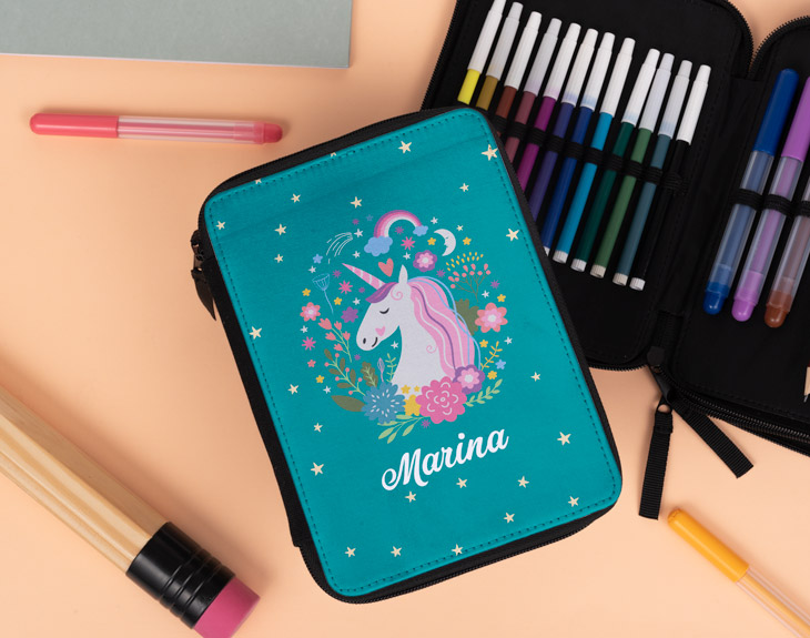 Un estuche para el cole personalizado con el unicornio del momento. Se trata de un regalo original ideal para la Vuelta al cole, ya que el niño podrá guardar todo su material escolar en un mismo sitio. Con muchos apartados para meter las pinturas de colores y todo lo necesario, este estuche personalizado con nombre se convierte en un detalle muy divertido y que saca muchísimas sonrisas. El estuche incluye dos compartimentos independientes cerrados con cremalleras. Al abrirlos podrás encontrar cuatro paredes con espacios para guardar todo el material escolar. Capacidad: - 24 ranuras elásticas de 1 cm - 3 ranuras elásticas de 1 cm - 1 ranuras elásticas de 4 cm - 2 ranuras elásticas de 1, 5 cm - 3 ranuras elásticas de 4, 5 cm Medidas del estuche: 21cm x 15cm. Importante: no se incluye el contenido del estuche.
