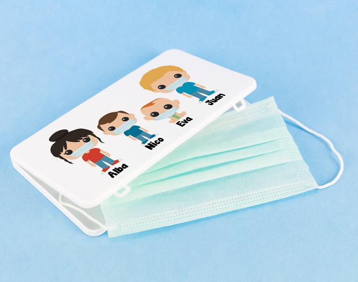 Cuida tu mascarilla de la manera más original con este estuche personalizado. Y es que, además de ser de lo más divertido y práctico, es perfecto para mantener tu mascarilla bien protegida. Así no tendrás que preocuparte cada vez que la guardes en el bolso o cuando llegues a casa y no sepas diferenciarla con las de tu familia. ¡Todo el mundo tendrá claro cuál es la suya! Basta con que selecciones el personaje que más se parezca a cada uno de vosotros y podrás tener la funda de mascarilla más guat de todas. Medidas:19 x 11 cm Importante: a partir de 6 personajes. se colocarán en dos filas. Es decir: - Familia de 6 personajes: 3 en la fila superior, y 3 en la inferior. - Familia de 7 personajes: 4 en la fila superior, y 3 en la inferior. - Familia de 8 personajes: 4 en la fila superior, y 4 en la inferior.