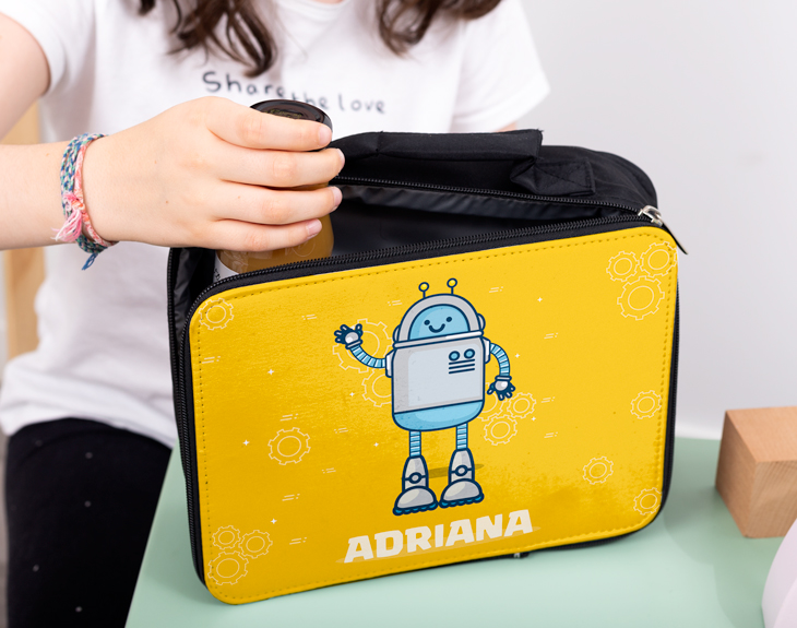 Si estáis cansados de que tu hijo se olvide cada día la comida en casa, nuestra bolsa para la merienda personalizada es la solución. Tiene un diseño tan guay que no se irá ni un día sin ella. Además de ser un regalo original y súper divertido, es muy práctico. Una forma muy divertida de que cada día esté deseando salir del cole para ver qué le toca de merienda. Tiene un tamaño perfecto para transportarla, pero a la vez que pueda hacer una merienda en condiciones. ¿No te parece una idea genial? Medidas: 24 x 8 x 7 cm.