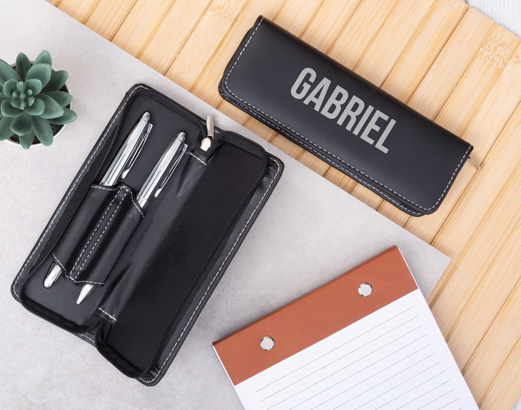 Todos conocemos a esa persona que se pasa el día firmando papeles y de un lado para otro y sabemos que no quiere perder el tiempo buscando un boli para dejar su firma en papeles importantes. Así que toca sorprender a esa persona con algo que seguro le será muy útil: ¡su propio estuche personalizado con bolígrafos! Es el regalo perfecto para cualquier persona que trabaje en una oficina porque seguro que nadie tiene algo igual. ¡Le encantará! Sin duda este original regalo es perfecto para sorprender a alguien especial en cualquier ocasión, porque seguro que tiene muchos bolígrafos o plumas pero ninguno tan especial como este con un estuche negro personalizado que podrá llevar donde quiera. Es el detalle perfecto que dejará sin palabras a cualquier persona, así podrá tener sus bolis favoritos siempre bien protegidos y a mano. ¡Es lo más! No te olvides de personalizar este estuche para que sea único. Añade el producto al carrito y entra en el área de personalización. Lo único que tienes que hacer es escribir el nombre que quieras que aparezca en esta funda y nosotros nos encargamos de que quede perfecto. ¡Estará listo para entregar! Medidas del estuche:17 x 6 x 2,3 cm. Importante: incluye dos bolígrafos.