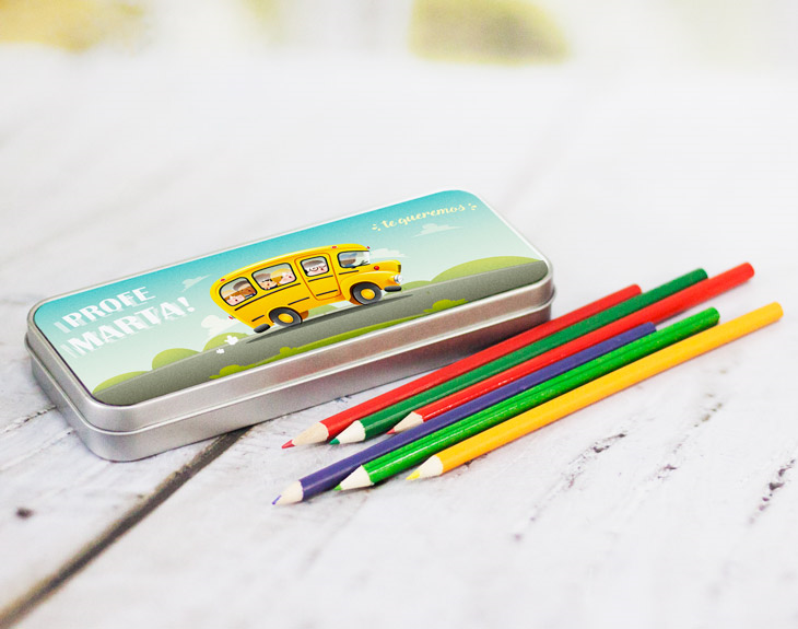 Este estuche metálico personalizado es una original y divertida forma de decirle a vuestro o vuestra profe que es la mejor del mundo y que la queréis mucho. Aprovechad el final del curso para darle las gracias por todo lo que habéis aprendido en sus clases y por lo mucho que os ha ayudado. Seguro que a vuestra profe le hace mucha ilusión que sus alumnos le hagan un regalo tan especial como este. Estamos convencidos de que a partir de ahora este estuche irá con ella a todas partes. Personalizar este estuche es muy sencillo, solo nos tenéis que decir el nombre de vuestro o vuestra profe y nosotros nos encargaremos de que el diseño quede perfecto. ¡Le encantará! Material: aluminio. Medidas: 2,5 cm x 7,5 cm x 18,5 cm.