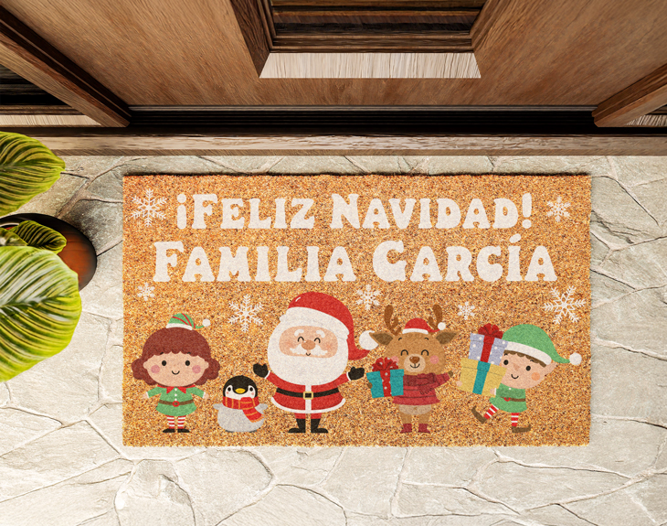 Con este felpudo personalizado tendrás el rellano más original del mundo. Convierte a tu familia en alegres duendes o elfos de Papá Noel y disfruta de la mejor época del año. ¡También tenemos renos y al propio Santa Claus! Personaliza hasta 6 personajes. Si eliges los seis, se colocarán en dos filas. Es decir, 3 en la parte superior y 3, en la inferior. Importante: a partir de 6 personajes irán distribuidos en dos filas. Es decir: - Familia de 6 personajes: 3 en la fila superior, y 3 en la inferior. - Familia de 7 personajes: 4 en la fila superior, y 3 en la inferior. - Familia de 8 personajes: 4 en la fila superior, y 4 en la inferior.