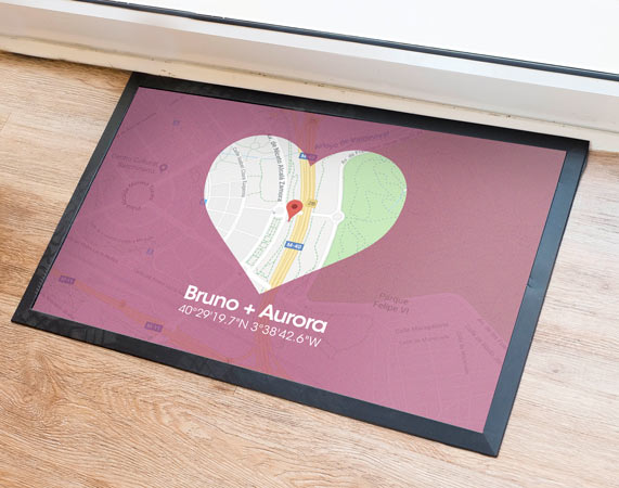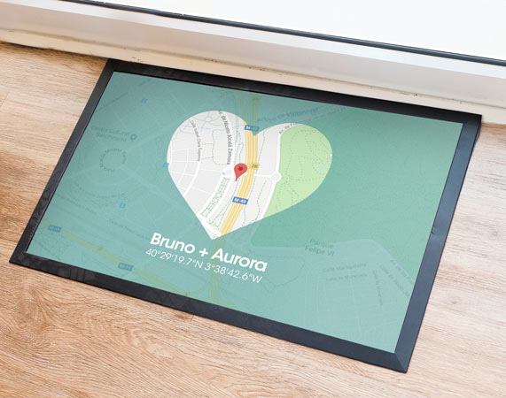 Felpudo personalizado con un mapa, unas coordenadas y dos nombres. Perfecto para señalizar la entrada a vuestro nidito del amor o simplemente para recordar ese lugar especial en el que empezó todo. -Durabilidad: 1 año. Material: goma y microfibra.