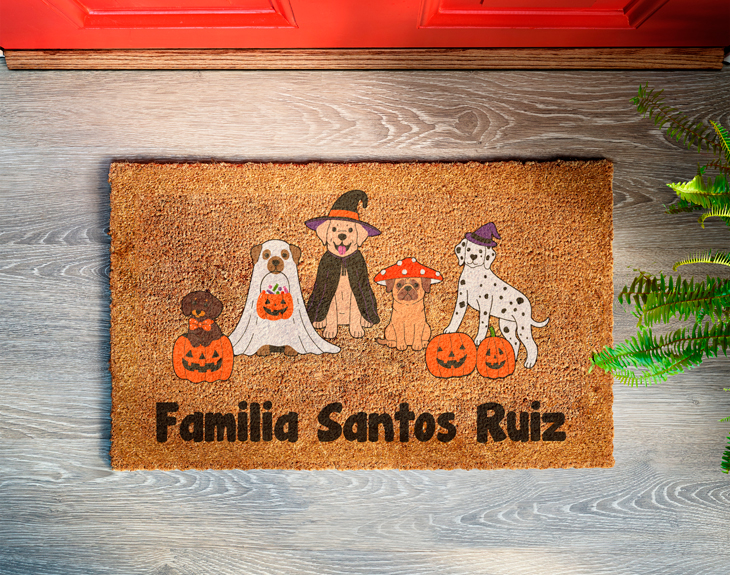 ¿Eres de esas personas a las que les encanta decorar la entrada del hogar según la época del año? Navidad, verano, primavera y por supuesto Halloween. Si ya estás preparando tu casa para esta temporada tan espeluznante, este felpudo personalizado es justo lo que necesitas para dar la bienvenida con terror y un poquito de miedo a todos tus invitados. Y si conoces a alguien que adore los perritos y también sea fan de Halloween, este felpudo con diseño Halloween es el regalo ideal. Un detalle original y divertido que une sus dos pasiones en un solo accesorio que, además de útil, será la envidia del vecindario. Imagina la escena: calabazas, telarañas, luces tenues y en la puerta, un felpudo con perritos disfrazados de brujas, fantasma y con calabazas tenebrosas. Terroríficamente adorable. Y lo mejor es que puedes personalizarlo con el nombre de la familia o una frase divertida como "Atrévete a entrar, el terror te espera". Sin duda, el regalo para el hogar que muchos quisieran tener en estas fechas. Personalizarlo es facilísimo: solo tienes que elegir el modelo que más te guste y escribir los nombres, apellidos o esa frase especial en nuestro diseñador. Y listo tendrás el felpudo original que convertirá tu entrada en la combinación perfecta de miedo y ternura. Importante: este felpudo está pensado para uso decorativo y no para zonas de alto tránsito. Si se expone a condiciones climáticas adversas o a un uso intenso, su durabilidad puede reducirse. Importante: está fabricado en fibra de coco natural, por lo que puede presentar ligeras variaciones de color. Los detalles de la imagen pueden no verse con la misma nitidez que en una pantalla retroiluminada, pero el resultado sigue siendo único y encantador.