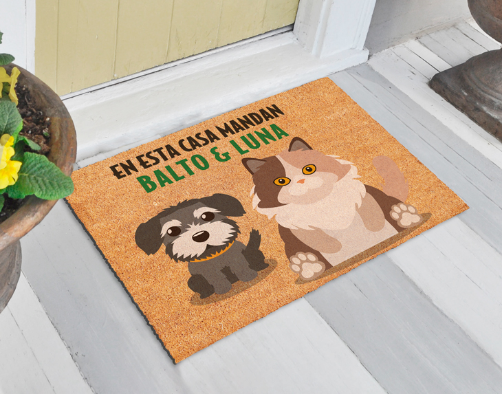 Si las mascotas son lo tuyo o quieres hacer un regalo a una persona amante de los animales, este felpudo personalizado es exactamente lo que necesitas. Podrás diseñar tu propio felpudo creando a medida a tu perro, gato, ratón...¡además también podrás combinarlos! Tenemos dos medidas disponibles:; 60x30cm y 70x40cm, escoge la que mejor se adapte a la entrada de tu hogar y dale un toque muy especial. Tienes que tener en cuenta que este felpudo tiene fines decorativos, no es un producto de alto tránsito. Por tanto, si lo expones a condiciones climatológicas adversas o tiene un uso intenso su durabilidad puede reducirse. Importante: son felpudos de fibra de coco natural, por tanto pueden tener variaciones de color. Además, los detalles pueden no ser tan perceptibles como en una pantalla retroiluminada.