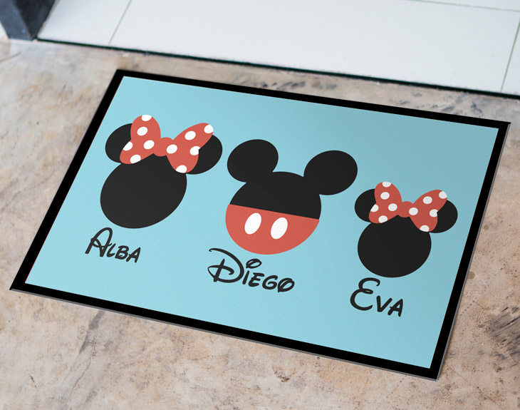 Todas las películas de Disney coinciden en algo: ¡la familia es lo más importante! La gente con la que vives será con la que compartas algunos de tus momentos más relajantes: cenando, viendo películas en el sofá, hablando... Si vuestra casa se ha convertido en este hogar tan especial digno de cuento Disney, no os puede faltar en vuestra entrada este felpudo de goma personalizado. ¡A todo color y bien grande con sus 70 centímetros de ancho! Convierte a tus compañeros de piso o familiares en estos monísimos iconos de Mickey y Minnie. ¡Con varios tamaños disponibles! Además, podrás escoger entre varias opciones de estos felpudos de colores personalizados con nombres. Una vez los tengas en el carrito, podrás ver todos los diseños con colores de fondos y añadir un nombre a cada símbolo seleccionado por separado. ¡Y tendrás una vista previa de lo bien que quedará! Cualquier persona muere de amor con las dulces mascotas de la factoría Disney, por lo que este será un gran regalo original para el hogar de cualquier amigo/a. ¡Añade un poco de alegría con el mejor y más bonito complemento para la entrada de su casa! Medidas: 70x40cm. Importante: nuestro equipo de personalización se encargará de ajustar la distribución de los personajes en el producto en función de su tamaño para que se vean lo mejor posible. Material: goma y microfibra.