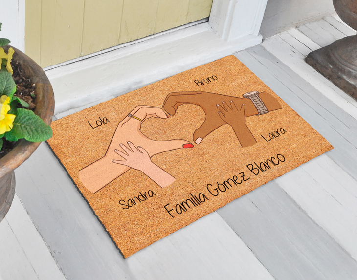¡Las mejores familias son las que están unidas! Seguro que para ti tus padres, tus hermanos o incluso tus mascotas son las personas más importantes de tu vida porque son tu familia y compartís muchos momentos juntos. Por eso, si queréis que vuestra casa tenga un toque único y muy personal, tenéis que adornar la entrada con este felpudo personalizado. Todos los invitados que vayan a entrar podrán ver este felpudo que representará a la perfección a vuestra familia. ¡Es el accesorio que no puede faltar en ninguna casa! Si queréis darle un toque único a vuestro hogar, no hay nada como decorar la puerta con este original felpudo. Un diseño que os representará como familia porque podéis añadir todos los detalles que queráis para que se asemeje con todos vosotros. Además, podéis elegir el tamaño de felpudo que más se ajuste a vuestra entrada para que quede perfecto y listo para recibir a todo el mundo. Pero no os podéis olvidar de personalizar vuestro felpudo. ¡Es muy sencillo! Elige el tamaño y añade el producto al carrito. Una vez hecho esto, ahí podrás acceder al apartado donde tendrás todo para crear tus propias manos con todo los detalles necesarios. También, podrás escribir los nombres de cada miembro de la familia para que aparezcan debajo del diseño. ¡Será un felpudo único que no tendrá nadie más! Importante: Podrás crear el diseño desde cero, eligiendo todos los detalles necesarios (color de la piel, accesorios para las manos, mezclar manos con patitas de gato o perro, pintar las uñas) Tienes que tener en cuenta que este felpudo tiene fines decorativos, no es un producto de alto tránsito. Por tanto, si lo expones a condiciones climatológicas adversas o tiene un uso intenso su durabilidad puede reducirse. Importante: Son felpudos de fibra de coco natural, por tanto pueden tener variaciones de color. Además, los detalles pueden no ser tan perceptibles como en una pantalla retroiluminada.