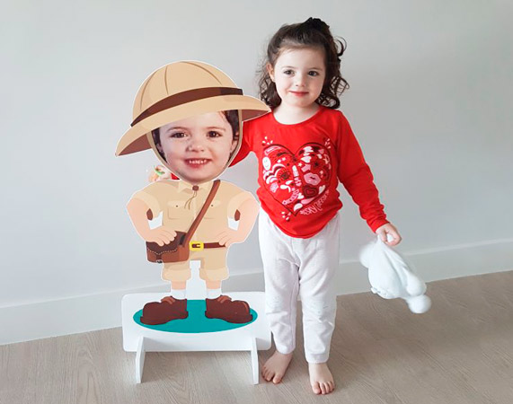 ¿Tu niño es súper curioso y le encanta explorar todo siempre? Este es el regalo perfecto para sacarle una súper sonrisa: una figura a tamaño real personalizada con la cara del pequeño o pequeña. Solo tienes que elegir una foto e insertar su cara en este cuerpo de pequeño explorador. La altura máxima son 120cm, por lo que te preguntaremos la altura de tu hijo para poder personalizar una figura a tamaño real. Es un regalo genial para adornar su habitación, para disfrutar de más juguetes en la sala de juegos o para las mejores fiestas o cumpleaños.