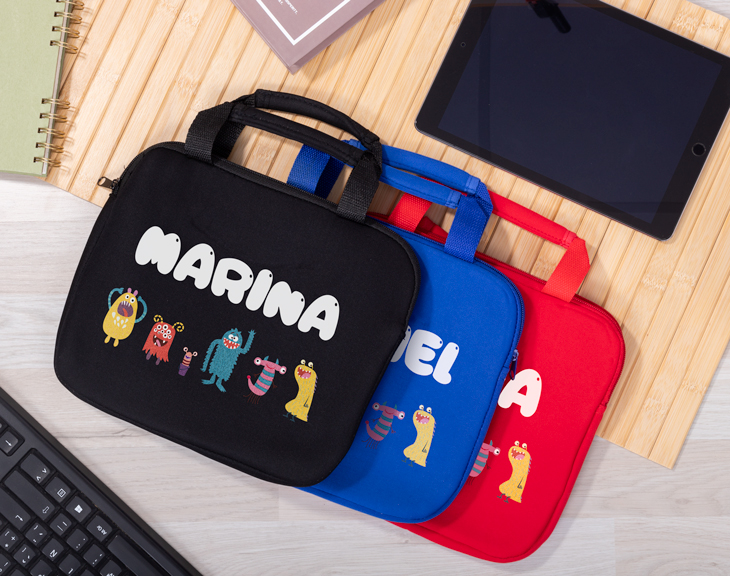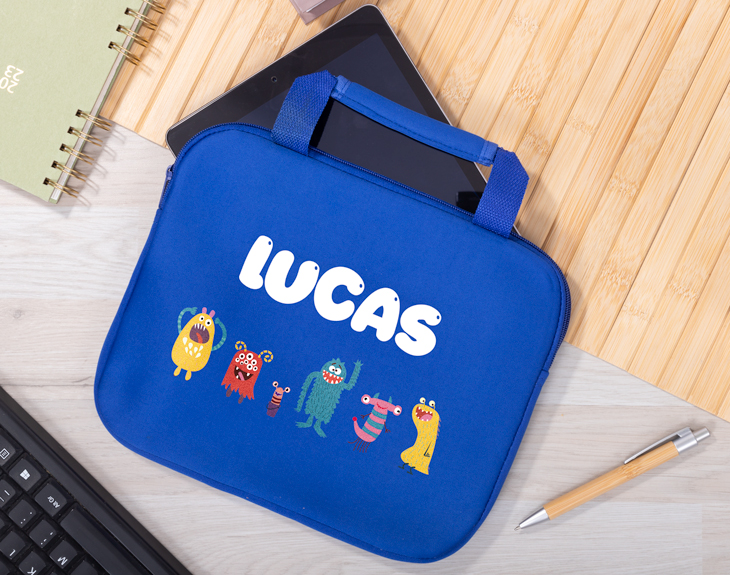 Si quieres llevar tu tablet vayas donde vayas y que siempre vaya muy bien protegida, necesitas esta funda para tablet. Su diseño hace que sea un regalo monstruosamente adorable porque, ¿a quién no le van a gustar estos divertidos monstruitos? Podrás tener la funda más guay del mundo y llevarla donde quieras. ¡A todo el mundo le encantará! Esta original funda puede ser el regalo perfecto para un cumpleaños, para el amigo invisible o incluso para sorprender al peque de la casa. A cualquiera le gustaría poder guardar su tablet o lo que quiera en esta funda tan chula. Además, podrás elegir el color que más te guste (rojo, azul o negro) y personalizarla con el nombre de la persona que va a recibir este regalo. ¡Es lo más! Para personalizar esta funda para tablet, el primer paso es añadir el producto al carrito y entrar en el área de personalización. Después, completa el diseño de monstruitos con un nombre y listo. ¡Tendrás la mejor funda del mundo! Medidas: 23,5 cm x 28,5 cm. Material: neopreno.