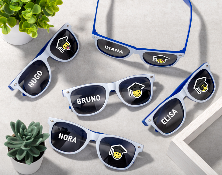 ¿Se acerca la fecha de tu graduación y quieres un accesorio lleno de color y alegría? Las gafas de sol personalizadas son perfectas para que luzcas guapo y con todo el estilo que merece ese día. Además, las fotos quedarán increíbles con ellas. Son el regalo original para graduados y el complemento perfecto para que tú y tus compañeros brilléis con luz propia. Podréis personalizarlas con el nombre del graduado y un dulce emoticono con birrete feliz, para que elijas el que mejor vaya con tu personalidad, además vienen en un color azul estupendo que combina con todo. Personalizarlas es superfácil: solo tienes que añadirlas al carrito, escoger el diseño que más te guste y escribir una frase corta o el nombre. En segundos tendrás las gafas de sol para graduación con nombre más molonas de todas. Ve y brilla como el sol con ellas. Características técnicas: - Lentes de categoría 3 - Protección UV400 - Conforme Norma ISO 12312-1 - Conforme Reglamento UE 2016/425 - Alta protección antideslumbrante - No aptas para observación directa del sol - Limpiar siempre con un paño suave