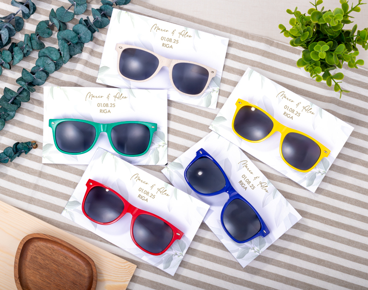 ¿Se acerca el día de tu boda? ¡Tenemos algo que no os puede faltar! Está claro que una boda es para celebrar el amor por todo lo alto acompañado de todos nuestros seres queridos. Por eso, nuestras gafas de sol con tarjeta con diseño "Soft nature" son ideales para tener un regalito con los seres queridos presentes en la boda. Además, lo mejor es que son personalizables, podrás escribir el nombre de los novios junto con la fecha de este día tan especial. ¡Quedará genial! Será un detalle súper especial para sorprender a los invitados de tu boda, es una preciosa forma de demostrarles lo mucho valoráis su compañía. ¡Será un recuerdo inolvidable! Personalizar estas gafas de sol con tarjeta es súper sencillo. El primer paso a seguir consiste en añadir el producto al carrito y entrar al área de personalización. Una vez ahí, ya puedes escribir los nombres de los novios junto con el día de su boda. Pronto estará perfecto y listo para regalar. ¡Será un original regalo para bodas! Medidas: 22 x 7,5 centímetros.