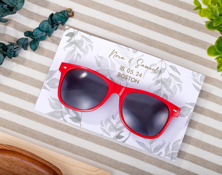 • Tarjeta personalizada. • Gafas de sol. • Tarjeta recordatoria.