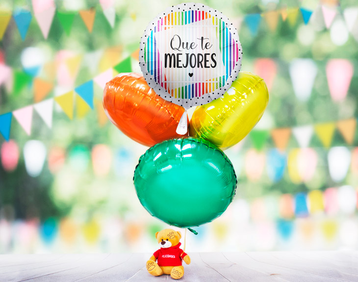 No hay nada más bonito que tener detalles con aquellas personas a las que queremos con locura, y más si están pasando por un momento delicado. No siempre estamos en nuestras mejores horas y un regalito cuando no te encuentras del todo bien puede hacer mucho. ¡Sorprende a esa persona tan querida gracias a esta bouquet con 4 globos! Este pack de cuatro globos de helio metalizado de 45 centímetros de diámetro está pensado para esas personitas que necesitan un empujoncito para salir adelante. Además de contar con estos globos también incluye un pequeño osito de peluche al que siempre abrazar cuando más lo necesite. Importante: el modelo de globo con el mensaje "Que te mejores" y el sabor de la tarta varían según stock.