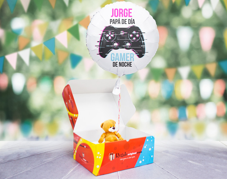 Sorprende a tu padre con el regalo más original ha recibido nunca. Se trata de un globo de gas personalizado con el diseño más divertido y adorable de todos. Y es que, si tu padre además de ser el mejor papá del mundo, también es el mejor gamer, le hará muchísima ilusión. Y es que, cuando abra la caja y aparezca el globo con su nombre conseguirás que se quede sin palabras. ¡Le encantará! Además, también puedes hacer que sea aún más especial añadiendo un detalle como por ejemplo una botella de vino, un chocomensaje o una caja de bombones. Si todavía no tienes regalo para su cumpleaños, para el Día del Padre o para cualquier otra ocasión especial, esta es la solución a todos tus problemas. ¡Será un acierto asegurado! Importante: Excepto en la opción desinflada, en el resto de alternativas se presenta el globo hinchado y sujeto a un osito de peluche. Si seleccionas el globo desinflado, no se podrá inflar a pulmón.
