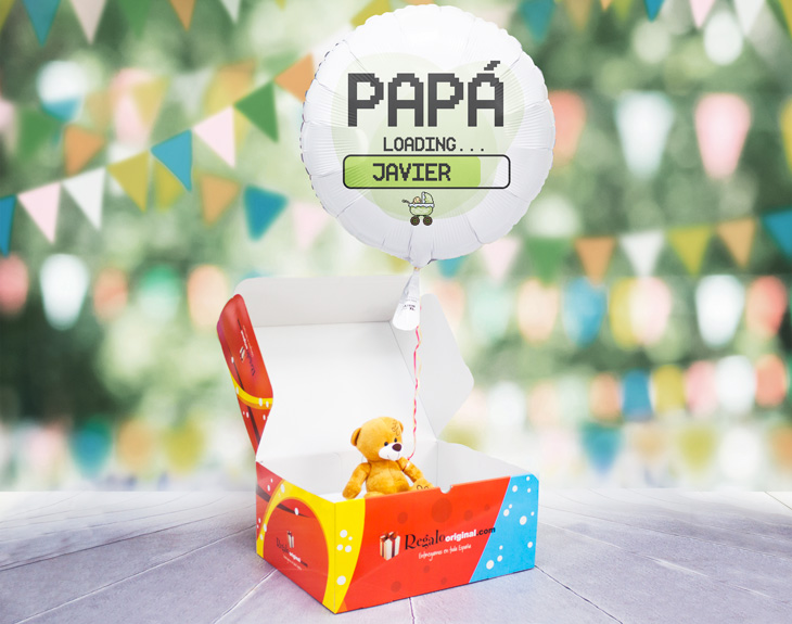 Estos meses de espera hasta que nazca vuestro bebé van a estar llenos de expectación. ¿Quieres añadir un poco más de emoción a la espera con un detalle perfecto para tu pareja? Haz que se emocione aún más para ser padre con este original globo personalizado. ¡Puedes inscribir su nombre o el de vuestro futuro bebé! Al ser un globo metalizado, aguantará de sobra hasta que nazca el bebé. ¡Y mucho más! Así, aunque ya no sea un padre en proceso, le encantará tener colgado en cualquier sitio este recuerdo de aquellos bonitos meses de embarazo, cuando vuestro hijo/a todavía se estaba cargando. Como se trata de un regalo enfocado a vuestro bebé, la caja vendrá acompañada de un monísimo osito de peluche sonriente. ¡Podría ser el primer regalo de vuestro bebé! Así llenarás de ilusión al padre y al hijo/a. Importante: Excepto en la opción desinflada, en el resto de alternativas se presenta el globo hinchado y sujeto a un osito de peluche. Si seleccionas el globo desinflado, no se podrá inflar a pulmón.