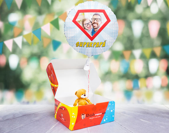 No todas las casas tienen un superpapá. ¿Eres un afortunado y estás viviendo con uno de ellos? ¡Qué suerte! Es hora de hacerle un regalo súper original: un globo personalizado con la foto que más te guste. Puedes aprovechar el Día del Padre, su cumpleaños o cualquier día que te apetezca darle una sorpresa. El globo va acompañado de un osito de peluche, y todo ello, metido en una caja enorme. Imagínate la sorpresa de papá cuando abra la caja. ¡Dale una sorpresa de 10 a tu superpapá! Importante: Excepto en la opción desinflada, en el resto de alternativas se presenta el globo hinchado y sujeto a un osito de peluche. Si seleccionas el globo desinflado, no se podrá inflar a pulmón.