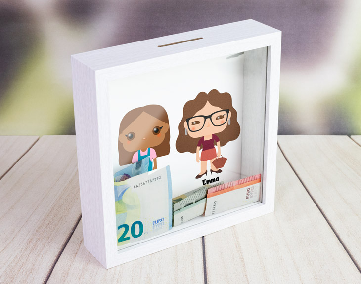 Muchos de los planes que tenemos pensado hacer en un futuro, cuestan dinero. Por eso, si estás pensando en ahorrar un poco de dinero para viajar o comprarte algo muy especial, nuestra hucha de madera personalizada es el accesorio perfecto para llenarla de billetes y monedas. Tiene el tamaño y la forma perfecta para poder meter mucho dinero y además ver todo lo que llevas ahorrado. ¡Así tendrás mucha más motivación para seguir! Además, esta original hucha con Tinoks es el regalo perfecto para alguien que tiene como propósito ahorrar algo de dinerito y darse un capricho. Hecha de madera y con un cristal para poder ver en todo momento lo que ahorras. Esta súper hucha es genial también para decorar cualquier rincón de casa. ¡Será el mejor regalo del mundo! Y si quieres que este regalo quede perfecto y listo para usarlo, tienes que personalizar la hucha de madera. Es muy sencillo. Añade el producto al carrito, y empieza a crear tu diseño. Podrás añadir hasta ocho Tinoks y elegir entre los que ya están hechos o crear el tuyo desde cero para que sea único y personal. Por último añade el nombre de cada Tinok y... ¡ya estará lista para regalar! Para abrir la hucha de madera podrás hacerlo en la parte trasera, donde encontrarás el cartón que cierra la hucha. Ahí tendrás que abrir las cuatro pestañas negras que encontrarás a cada uno de los lados de la hucha. Ahora podrás retirar el cartón y obtener todos tus ahorros. ¡Será el momento de hacer ese viaje que tanto has soñado!