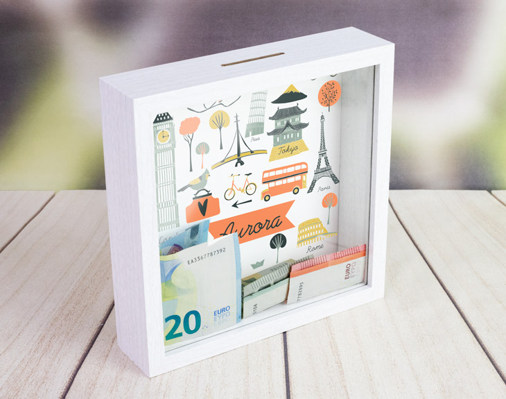 Seguro que alguna vez has querido visitar la Torre Eiffel en París, el Big Ben en Londres, la Torre de Pisa en Italia... ¡hay muchos monumentos que merecen ser vistos una vez en la vida! Por eso, viajar es una de las mejores cosas en las que invertir nuestro dinero. Si estás pensando en hacerte el viaje de tus sueños, necesitas esta hucha de madera personalizada para meter todos tus ahorros en ella. Tu misión será llenarla de billetes y monedas para cada viaje que quieras hacer. ¡Es un súper regalo! Si se acerca cualquier ocasión o celebración y necesitas un regalo único, diferente y personal, seguro que aciertas con esta original hucha cuadrada donde podrás empezar a ahorrar para conseguir lo que quieras. Esta hucha esta fabricada en madera, tiene una ranura para introducir monedas y billetes y un cristal para poder ver todo lo que llevas ahorrado. Así será mucho más fácil motivarte. Y como queremos que este regalo sea muy especial, tendrás que personalizar esta hucha de madera a tu gusto. Añade el producto al carrito y comienza a diseñar tu propia hucha. Solo tendrás que añadir el nombre que quieras que aparezca junto al diseño y nosotros nos encargamos de que quede perfecto y listo para regalar. Además de ayudarte a ahorrar, te servirá como decoración para cualquier parte de la casa. ¡Es el mejor regalo del mundo! Para abrir la hucha de madera podrás hacerlo en la parte trasera, donde encontrarás el cartón que cierra la hucha. Ahí tendrás que abrir las cuatro pestañas negras que encontrarás a cada uno de los lados de la hucha. Ahora podrás retirar el cartón y obtener todos tus ahorros. ¡Será el momento de hacer ese viaje que tanto has soñado!