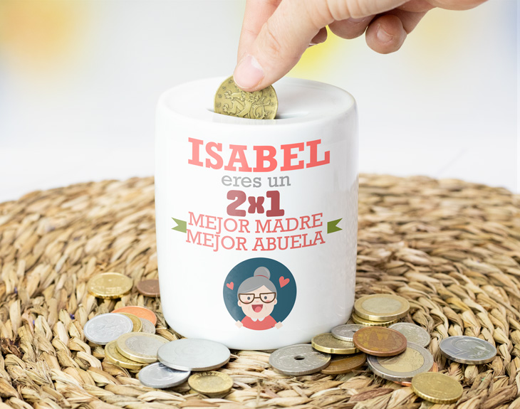 Seguro que, si eres consciente de todo lo que tu madre ha hecho por ti, ¡quieres devolvérselo todo multiplicado por 100! Pero quizás no tienes tiempo, dinero... para hacerlo de la manera grandiosa que ella se merecería. ¿Por qué no empezar con un detalle que sea a la vez un regalo en sí y una promesa de un futuro regalo? Sorpréndela con esta hucha personalizada y comenzad a ahorrar para ese futuro viaje que os unirá aún más. Tu madre siempre se da a los demás: a ti, y ahora también a tus hijos. Pero esta vez, el regalo es para ella. Por ello, puedes personalizar esta original hucha cilíndrica donde empezaréis a guardar esas monedas sueltas que, con el tiempo, os llevarán a donde vosotros queráis. ¡Id pensando donde queréis ir! Además de ser un bonito regalo original y un medio para conseguir algo mayor, esta hucha de 9,5 centímetros de altura es una de las muchas y muy buenas maneras que tienes de decirle a tu madre lo que tanto le gustará oír: que vale para todo, mucho más que todo el dinero que podáis meter en la hucha, y no solo es la mejor madre, ¡sino que también es la mejor abuela! Importante: la hucha cuenta con una apertura de tapón oculto en la parte baja para extraer el dinero. Altura: 9,5cm.