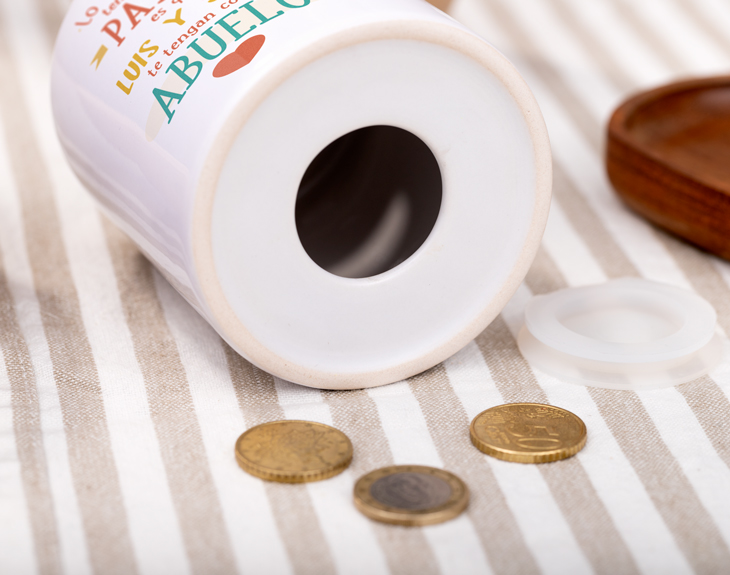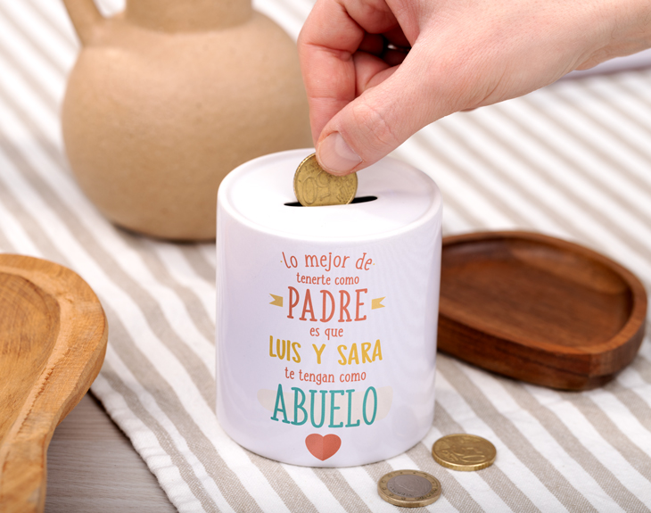 ¿Tienes un padre ejemplar que además es un fantástico abuelo? ¡No dejes que pase un día más sin decírselo! Y esta vez, puedes hacerlo de la manera más diferente y divertida. Sorpréndele con su propia hucha personalizada de casi 10 centímetros de altura. En lugar de venir con su nombre, ¡tendrá el de sus nietos! Gracias a este regalo original, tu padre podrá ahorrar poco a poco pensando en todo lo que quiere hacer sus nietos. ¡Así puede darles todo lo que quiera! Pero seguro que le encantará, por encima de todo, por su diseño: con esta chulísima tipografía, le agradecerás todo lo que ha hecho por ti y lo afortunado que son tus hijos de tenerle como abuelo. ¡Verás la alegría que le entra cada día al mirar esta original hucha cilíndrica! Empezará a ahorrar muy fácilmente y, cuando no estéis juntos, se sentirá más arropado que nunca por la familia a la que tanto tiempo y amor ha dedicado. Importante: la hucha cuenta con una apertura de tapón oculto en la parte baja para extraer el dinero. Altura: 9,5cm.