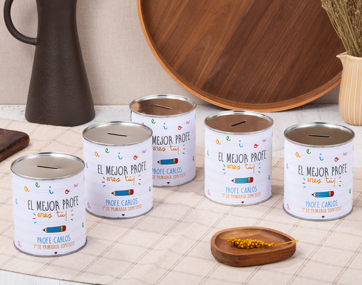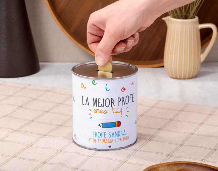 En la escuela enseñan a los niños a escribirles mensajes bonitos a sus padres, a sus hermanos, a sus amigos... Pero, ¿cuándo fue la última vez que tus hijos/as le dijeron a su profesor/a lo mucho que le quieren? Ayúdales a hacerlo de la manera más original y bonita con esta hucha de lata personalizada. Gracias a nuestro colorido diseño escolar, será como si estén utilizando una hoja de renglones típica de sus cuadernos. ¡Pero con una caligrafía preciosa! Todo el mundo necesita ahorrar, incluso los funcionarios. Por ello, esta hucha le puede acompañar en su casa a lo largo de mucho tiempo. Y para que sea además de útil un buen regalo original para profesores, podrás dedicarle este pegadizo refrán con el texto que quieras. Añade el producto al carrito y mira en la previsualización lo bonito que quedará tu mensaje en dos líneas. Si no sabes qué regalar a tu tutor/a para fin de curso, esta hucha redonda de metal le hará muchísima ilusión y le será de utilidad. ¡Que se despida de la clase con un buen sabor de boca! Medidas: -32 cm de circunferencia -10 cm de diámetro -11,5 cm de altura Material: metal Importante: esta hucha no está preparada para abrirse frecuentemente. Una vez abierta no se puede volver a cerrar.
