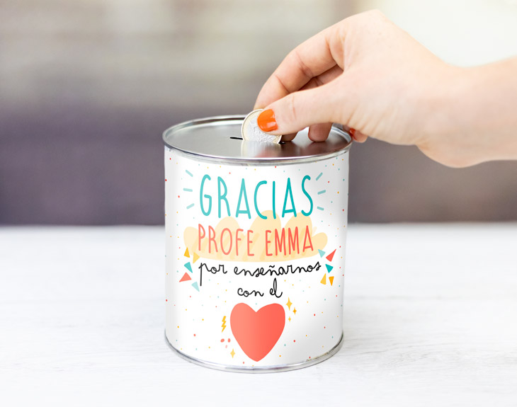 La mejor recompensa que puede recibir un profesor es todo el cariño de sus alumnos. ¡Y unas buenas vacaciones también! ¿No te gustaría ayudarle a ahorrar para ese viaje en sus vacaciones de verano a la vez que se lleva un bonito recuerdo del curso? Emociónale con esta hucha de lata personalizada con nombre. Con ella, podrás darle las gracias por haberos enseñado con tanto amor durante tantos meses. Aunque no puedas darle un detalle de fin de curso muy grande, sí que puedes ayudarle a permitirse todo lo que quiera. Cada vez que vea esta hucha circular se acordará de vosotros y no le costará nada ahorrar. Pero además de ser bonita, ¡será exclusiva para él/ella! Puedes escribir su nombre sobre este regalo original para profesores. Ya sea para ahorrar o como elemento decorativo, esta hucha redonda de metal será la dedicatoria más bonita para tu profesor/a favorito/a. Medidas: -32 cm de circunferencia -10 cm de diámetro -11,5 cm de altura Material: metal Importante: esta hucha no está preparada para abrirse frecuentemente. Una vez abierta no se puede volver a cerrar.