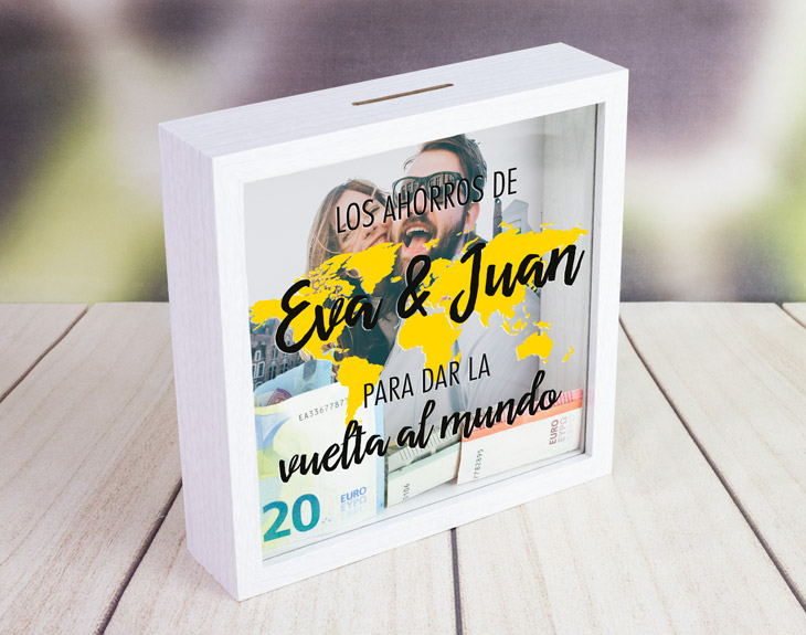 ¿Quién es esa persona con la que te irías hasta el fin del mundo? Seguro que aún tenéis muchísimos lugares a lo largo y ancho de la Tierra por recorrer. Da igual lo que tardéis, ¡algún día los visitaréis todos! Y como queremos ayudaros a conseguirlo, hemos creado justo para vosotros esta hucha de madera personalizada y con foto. Hemos puesto el mapa del mundo justo en el cristal frontal para que siempre tengáis la mira puesta en todos los lugares a los que algún día podréis ir. ¡Tan solo toca ahorrar diariamente! Este es un regalo original para esos amigos, familiares o pareja que les encantan las aventuras y viajar al extranjero. Pero también, sería un estupendo detalle con esa persona con la que quieres hacer tantos viajes. Por ello, puedes llevarte dos huchas con el mismo o diferente diseño por un precio menor que si las compraras por separado. ¡Y puedes personalizar cada una con el texto e imagen que quieras! Además de poder crearla a tu gusto, esta hucha blanca cuadrada no desentonará con la decoración de tu hogar como muchas otras huchas. Por ello, será tanto un buen lugar donde guardar el dinero como un bonito elemento de decoración de tu casa. Simplemente dinos una vez añadas el producto los nombres a grabar sobre el cristal y la imagen que irá en el cartón de fondo, y ya habréis dado el primer paso de ese viaje que, con el dinero que guardaréis aquí dentro, algún día ocurrirá. Para abrir la hucha de madera podrás hacerlo en la parte trasera, donde encontrarás el cartón que cierra la hucha. Ahí tendrás que abrir las cuatro pestañas negras que encontrarás a cada uno de los lados de la hucha. Ahora podrás retirar el cartón y obtener todos tus ahorros. ¡Será el momento de hacer ese viaje que tanto has soñado!