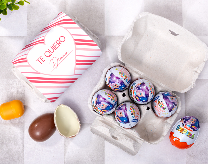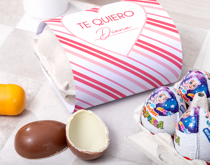 ¿Tu pareja y tú comparten el amor por el chocolate? Si ambos sois unos golosos sin solución, esta huevera personalizada llena de chocolate Kinder tiene vuestro nombre. Es el detalle perfecto si todavía no tienes regalo para San Valentín o para vuestro aniversario. Y es que, además de ser un acierto asegurado por el chocolate, tiene un diseño de "Corazón" de lo más romántico. ¡Se emocionará muchísimo al verlo! Lo mejor de esta huevera además de que viene llena de 6 chocolates Kinder Joy, es que es personalizable. Dentro de nuestro diseñador podrás escribir el nombre de tu amor y añadir el mensaje que quieras. ¡Le encantará! Personalizar esta huevera es muy sencillo. Solo tienes que añadir el producto al carrito y entrar al área de personalización. Allí, encontrarás este tierno diseño en el que podrás añadir el texto que quieras. ¡Celebra el Día de San Valentín con total dulzura! Medida: 18 x 12 cm.