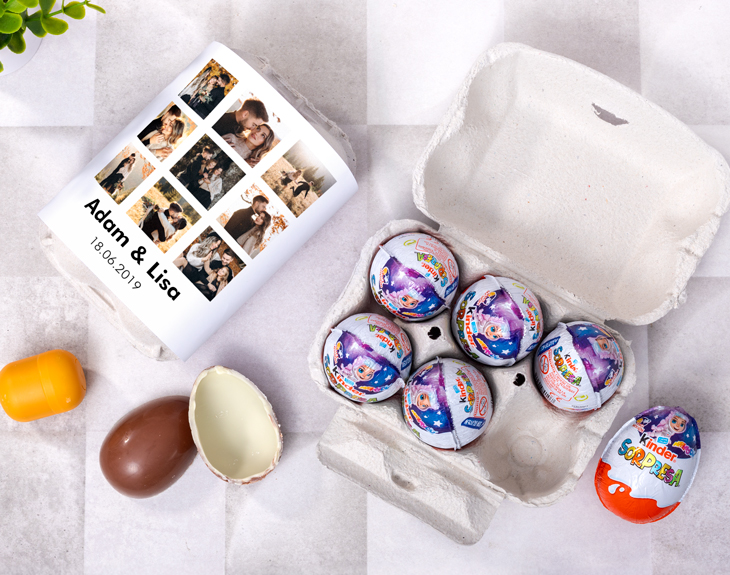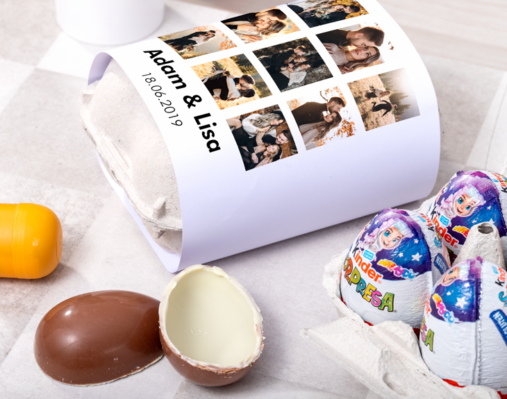 Regalar chocolate el Día de San Valentín es un clásico que siempre acierta, pero si quieres sorprender de una manera original tenemos la solución: esta huevera personalizada con fotos. Con un diseño romántico de "Nuestros Recuerdos" y llena de 6 chocolates Kinder, será el regalo perfecto para sorprender a tu pareja en este Día de los Enamorados. Lo que hace especial a esta huevera es que es personalizable: puedes añadir vuestras fotos favoritas y un texto debajo. Tal vez vuestros nombres, la fecha en que os conocisteis, o vuestro aniversario de boda... ¡tú eliges! ¿Cómo personalizar esta original huevera llena de chocolate? Solo tienes que añadir el producto al carrito e ingresar al área de personalización. Allí dentro encontrarás este precioso diseño con los recuadros para subir las fotos que quieras y escribir el mensaje para quien lo reciba. Sin dudas, ¡será un regalo original para parejas! Medida: 18 x 12 cm.