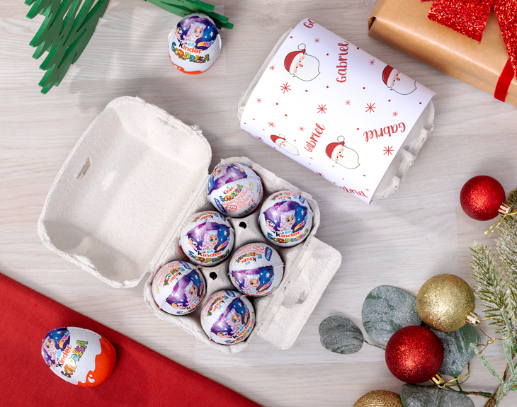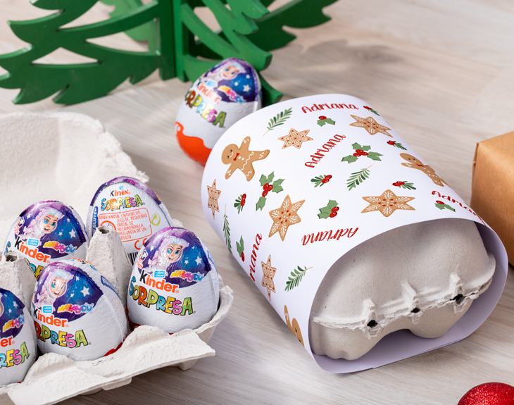 • Huevera personalizada con 6 Huevos Kinder. • Tarjeta Recordatoria.