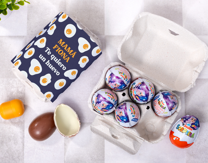 Todos tenemos esa persona especial a la que nos gustaría sorprender con un detalle único. ¿Qué tal una huevera llena de chocolate Kinder para demostrarle lo importante que es para ti? Nuestra huevera personalizada con un diseño divertido es el detalle perfecto para sorprender a esa persona especial en cualquier ocasión: cumpleaños, San Valentín, amigo invisible… ¡cualquier momento es ideal para endulzar su día! Esta huevera original es personalizable con el nombre que tú elijas, pensada especialmente para los fanáticos del clásico chocolate Kinder, un dulce que nunca pasa de moda. Además, puedes optar por el diseño con o sin caritas, ¡tú decides! Seis huevos Kinder te esperan. ¿Cómo personalizar esta original huevera? ¡Muy fácil! Solo añade el producto al carrito y accede al área de personalización. Ahí podrás escribir el nombre de quien lo reciba, ¡y listo! Pronto estará listo este regalo original para esa persona que tanto quieres. Medida: 18 x 12 cm.