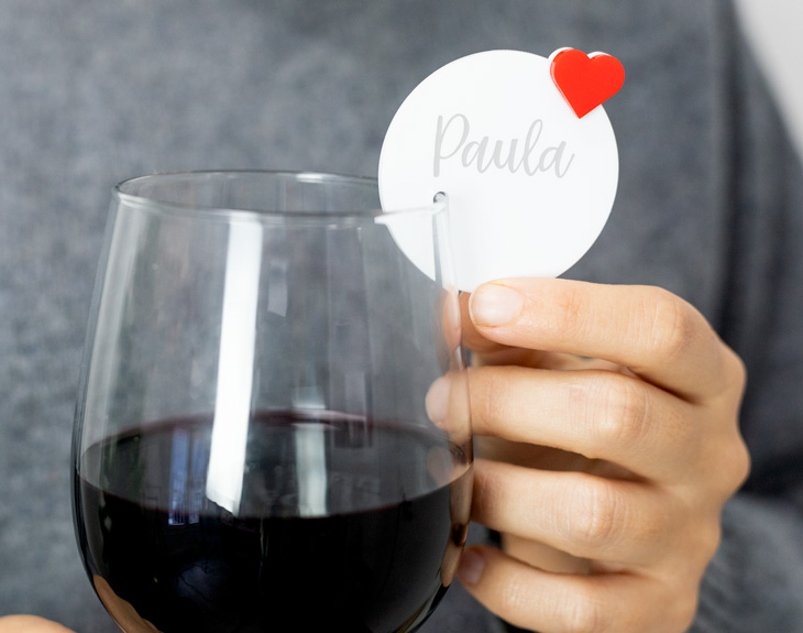 Nuestra vida está llena de personas que van y vienen pero algunas de esas personas se quedan y dejan huella dando lugar a momentos super bonitos que recordaremos siempre. Tomarnos un simple vino con ellos se vuelve algo mágico. Si quieres sorprender a esa persona especial cualquier momento es bueno, ¿qué te parece un identificador de copa personalizado. El nuestro está hecho de metacrilato y lo podrás personalizar con el nombre de esa persona a la que se lo quieras regalar, y este encima viene decorado con un corazón para que recuerden tu cariño en todo momento. Con este identificador de copas podrá saber al momento cuál es la suya. Para crearlo sólo necesitamos que nos digas el nombre que deseas que aparezca en él. Medida: 5x5 cm.