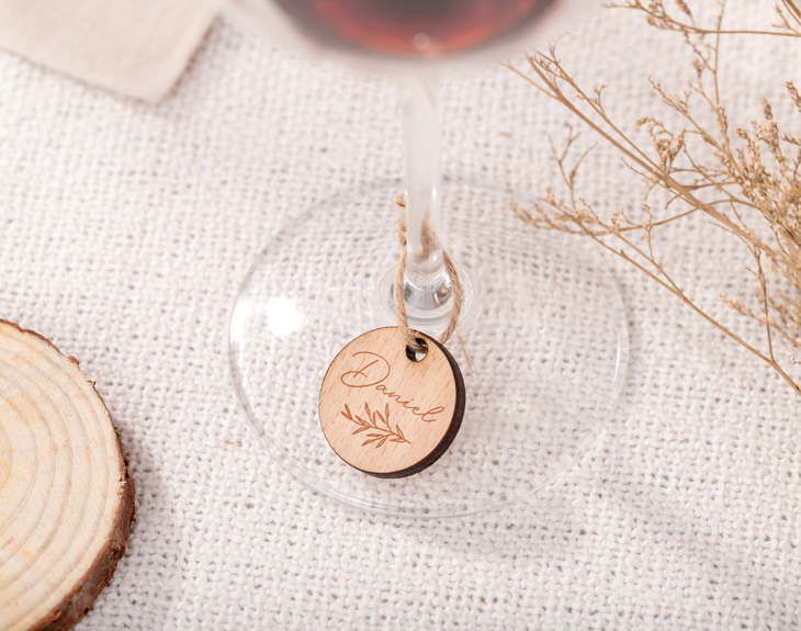Seguro que el día de tu boda es uno de los momentos más importantes de tu vida y del que guardarás los mejores recuerdos para el futuro. Por eso, tiene que estar todo muy bien organizado para que esta fecha sea perfecta de principio a fin. Y como cada detalle cuenta, si quieres organizar a los invitados en las mesas del banquete, hazlo con estos identificadores de madera personalizados que son lo más. ¡Son ideales para este tipo de ocasiones! Estos originales identificadores en forma de círculo y con un precioso diseño floral, son el detalle perfecto para ponerlos en cada una de las copas de todos tus invitados y tener un detalle personalizado con ellos que luego podrán guardar para el recuerdo. Nosotros nos encargamos de grabar en ellos el texto que quieras y el diseño que hayas elegido. Lo terminamos con una fina cuerda y listo para utilizar. ¡Son perfectos! Personalizar estos identificadores de madera es muy sencillo. Primero, vas a poder elegir cuántas unidades quieres y el tipo de personalización: todos iguales o distintos. Después, entrarás en nuestro diseñador donde podrás elegir qué diseño te gusta más y el texto que quieres poner en cada círculo. El último paso es recibirlo y disfrutar del día más importante: ¡vuestra boda! Medidas: 3 centímetros de diámetro.