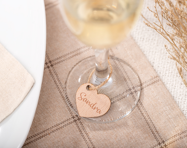 Nadie dijo que preparar un boda fuera fácil. Y es que hay miles de detalles que hay que tener en cuenta para la celebración más importante de tu vida. Como por ejemplo, que todos tus invitados sepan dónde se tienen que sentar y para eso solo te hacen falta estos preciosos identificadores de madera personalizados en forma de corazón. Son ideales para colocarlos en las copas de cada mesa. ¡Quedarán genial! Dale un toque único al banquete de tu boda con este original detalle que no pasará desapercibido para nadie. Podrás elegir tantas unidades como quieras y personalizar cada una de ellas con el nombre de cada invitado. Nosotros nos encargamos de grabarlo sobre la madera y darle esta forma de corazón que queda preciosa. Finalmente lo coronamos con una cuerdecita para que puedas ponerlo en las copas o donde tú quieras y listo. ¡Es lo más! Para poder personalizar estos identificadores, lo primero que tienes que hacer es añadir el producto al carrito. Después, entrarás en el área de personalización y podrás poner tantos nombres como quieras en cada maderita. Así de fácil. Con estos pequeños identificadores, le darás un toque diferente a tu boda. Medidas: 3 x 2,7 cm.