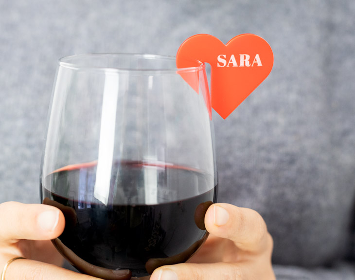 Las veladas con amigos con una copa de vino sientan mejor. Charlar, bailar, desestresarse del trabajo...¡Os lo merecéis! Si sois de los que se dejan la copa en la mesa y al volver no recuerda cuál era la suya este identificador personalizado os viene que ni pintado. Nuestros identificadores de copa son de metacrilato y personalizables con el nombre que deseéis, son una sorpresa ideal para cualquier momento y la persona que lo reciba lo adorará. Este diseño en concreto es un corazón completo que hará que se te recuerde con mucho cariño. Podéis hacerlos de 2 en 2, de 4 en 4 y de 10 en 10. Medida: 5x5 cm.