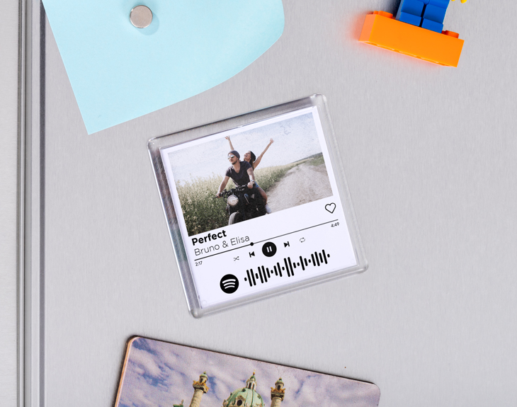 Es importante recordar todos los productos que tienes que comprar cuando vayas al super, o el número de teléfono de tu pizzería de confianza el día que necesitas. ¿Cómo puedes hacer eso de una forma original y de lo más musical? Este imán resistente para la nevera personalizado sujetará cualquier tipo de información importante que necesites saber. Para todas esas parejas que cuentan con una canción que siempre les recuerda al amor de su vida, este imán plano de madera o metacrilato es perfecto para ellos. Podrás elegir el material de dicho imán, dependiendo del que más te guste para tu nevera. Las medidas son de 6 centímetros cada lado, con 0,4 centímetros de grosor. ¡El tamaño perfecto para decorar tu frigorífico! Gracias a este regalo original para parejas, tu pareja siempre recordará vuestra canción cuando busque la lista de la compra. Este diseño emula al diseño de la aplicación Spotify. ¡Podrás personalizarlo con la foto, el texto y la canción que quieras! Solo tienes que entrar en el diseñador después de añadir el producto al carrito. ¡Es muy fácil personalizar este regalazo para la casa! Material: madera o metacrilato. Medidas: 6x6x0,4cm Importante: Las maderas tienen vetas y estas quedan reflejadas en la imagen. ¿Cómo se personalizan los productos Spotify? A la hora de personalizar tus productos relacionados con Spotify, tendrás que contestar a una serie de preguntas. De esta manera… ¡tendrás un regalo original de lo más musical! Cuando llegues al diseñador te encontrarás con la plantilla del producto, con tres apartados a personalizar (texto, foto y código Spotify). Para personalizar cada uno sólo tendrás que hacer click encima de cada cuadrado de personalización. Una vez dado, solo tendrás que escribir el texto y subir la fotografía a nuestro servidor. ¡Podrás modificar el color del texto o su lugar en el diseño! En el momento de añadir esa canción tan característica, no tendrás ningún problema. Escribe la canción o el artista que quieras en el buscador del código Spotify, y a partir de ahí aparecerán una serie de resultados. Solo tendrás que pinchar sobre la canción... ¡no tendrás que hacer nada más! Dependiendo del producto, podrás modificar las características del código: color, fondo o lugar. ¿Cómo se escanea el código? Para poder descubrir de qué canción se trata tendrás que abrir la aplicación de Spotify en tu teléfono móvil y darle al apartado "Buscar". En la parte superior encontrarás un buscador, cuando pulses sobre él verás que en la esquina derecha aparece un icono de una cámara. Al pinchar te abrirá la cámara, únicamente tienes que apuntar al código y automáticamente se reproducirá tu canción. Importante: Este producto es una réplica del diseño de reproducción de Spotify, pero NO es un altavoz.