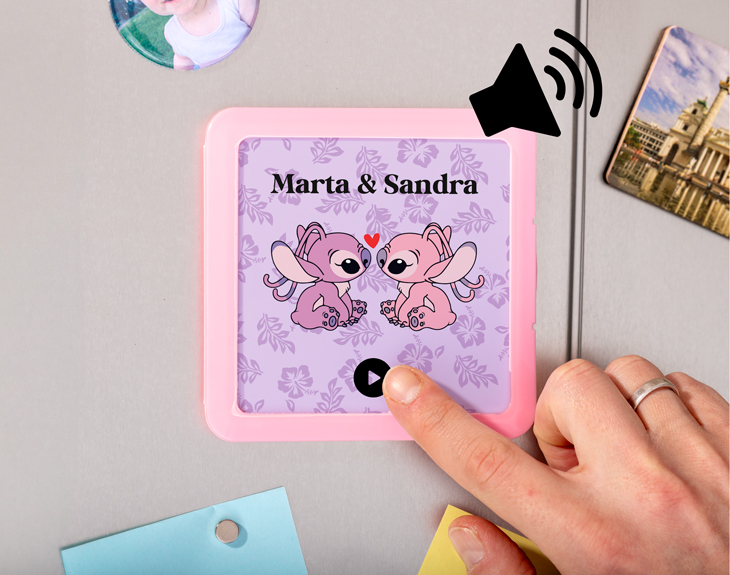 No hay pareja más tierna que la de Ángel y Stitch. ¡Estos dos adorables personajes han conquistado a todos! Si a ti y a tu pareja os encantan tanto como a nosotros, tenemos el regalo perfecto que seguro os hará flipar. Te presentamos nuestro imán musical personalizado "Pareja Stitch", una opción ideal si aún no has encontrado el regalo perfecto para San Valentín, un aniversario o un cumpleaños. Este original imán no solo será un detalle precioso para decorar vuestro hogar, ¡sino que también es un reproductor de música! Podrás añadir esa canción especial de ambos, y quien lo reciba podrá escucharla siempre que quiera. Solo tiene que pulsar el botón de "play" y comenzará a sonar. Y si prefiere dejar de escucharla, solo tendrá que pulsar nuevamente el botón. ¡El regalo más original para parejas! Personalizar este imán es muy fácil. Solo añade el producto al carrito y haz clic en "personalizar". Dentro de nuestro diseñador, podrás elegir los personajes que más os gusten y el fondo entre los colores azul o rosa. Para el audio, puedes subir tu canción favorita en formato MP3 o incluir un mensaje de voz. ¡Así de sencillo! Cuando lo recibas, podrás reproducirlo siempre que lo desees. Medidas del imán: 11 x 11 cm. Colores disponibles: rojo, rosa, amarillo, blanco y azul. Importante: Estos imanes musicales son recargables. Su batería, situada en la parte trasera, te permite conectar un cable USB de tipo C.