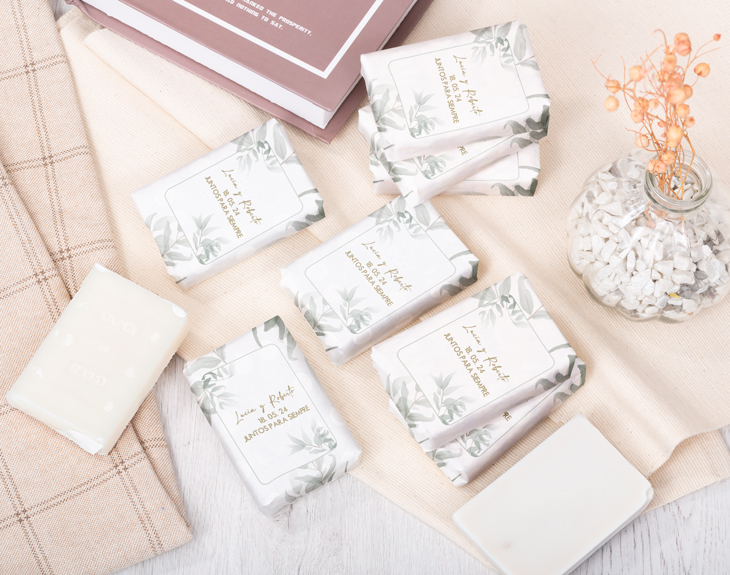 ¿Tienes próximamente un evento especial y estás buscando un detalle único para tus invitados? ¡Tenemos la opción perfecta! Se trata de un jabón personalizado con el texto que quieras y un diseño floral de lo más elegante. ¡No pasará desapercibido! Para personalizarlo, únicamente tienes que incluir en nuestro diseñador el texto que quieras, ya sean unos nombres, una fecha, un lugar o esa frase tan significativa para vosotros. De esta manera lo convertiréis en un detalle exclusivo y cargado de personalidad. Bodas, comuniones, cumpleaños, bautizos...¡es el regalo más original para cualquier tipo de celebración! Con la ayuda de nuestro selector de cantidad podrás escoger todos los que necesites, además, a medida que aumentes el número se actualizará el precio para que puedas saber en todo momento el coste total. Aunque no solo eso, también es una gran idea para dejar sin palabras a esa persona que adora todo lo relacionado con el mundo de la belleza y el autocuidado, ¡se enamorará tanto del diseño como del delicioso aroma que tienen! Además, están fabricados a partir de ingredientes vegetales y enriquecidos con aceite de coco, ¡la hidratación está asegurada! Disponible en dos aromas: coco o pera. Medida: 55 x 80 x 20 mm