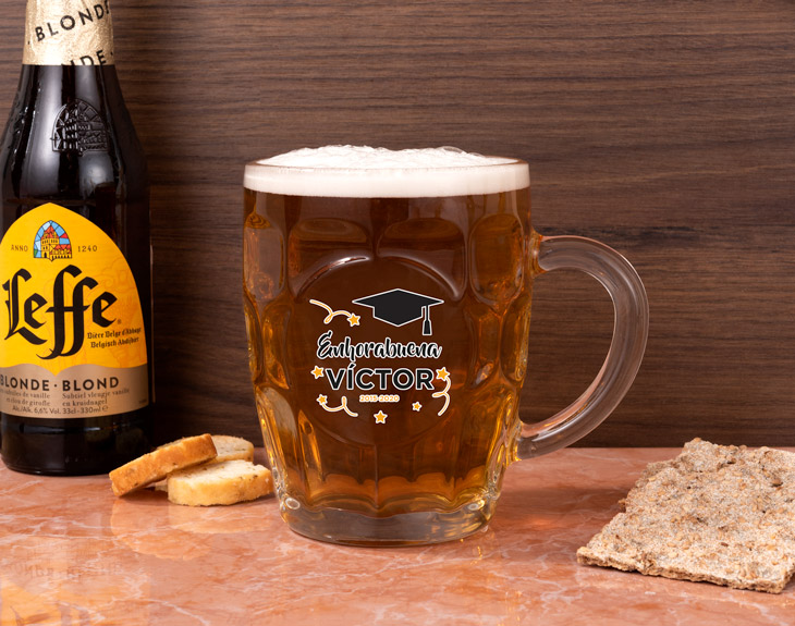 • Jarra de vidrio (55 cl). • Tarjeta Recordatoria. ¿Tus amigos y tú estáis a punto de acabar la carrera? ¿Sois unos auténticos cerveceros? Sorprender a nuestros seres queridos a veces es tan fácil como acordarnos de ellos en este tipo de ocasiones tan especiales. Con nuestra jarra bávara personalizada, dejarás sin palabras a tus compañeros y conseguirás un recuerdo indeleble de una de las etapas más importantes de vuestra vida. Brindar con vuestras propias jarras de cerveza cuando acabéis las clases, ¡es todo un lujazo! Nuestras jarras de cerveza bávara son una de las mejores elecciones cuando queremos disfrutar de una cerveza bien fresquita. Se caracterizan por ser más bajas y anchas que una jarra de cerveza convencional y cuentan con un exterior facetado que da más detalle al acabado final. En nuestro caso, la jarra cuenta con una zona circular a un lado, que es dónde imprimimos el diseño. Además, tienen un grosor de unos 4 mm y un asa para sujetarla, de manera que nuestra cerveza se conserve fresquita el máximo tiempo posible. Para el cuidado de tu nueva jarra, recomendamos el lavado a mano, ya que el lavado a lavavajillas puede dañar la impresión que realizamos sobre el cristal. Lo que queremos es tener un recuerdo para siempre, por lo que los cuidados con básicos en ese objetivo. De cara a la personalización, dispondréis de una plantilla con el diseño de birrete propio de un estudiante universitario. Debajo, y rodeado por estrellas, se encuentra el texto “Enhorabuena” y justo debajo irá registrado el nombre que nos indiquéis y las fechas de graduación de vuestro ser querido. Nosotros nos encargamos de imprimir ese diseño directamente en el cristal de la jarra para que tengas el detalle listo para sorprender en esa ocasión especial.