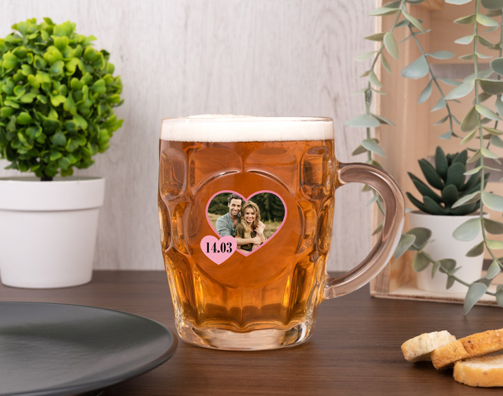 Tienes a una persona importante en tu vida a la que le quieres demostrar todo lo que significa para ti. Esos momentos que pasáis juntos son inolvidables y os hacen conoceros cada vez más. Una de las cosas que habéis conocido del otro es el gusto por la cerveza, con nuestra jarra bávara personalizada tendrás el regalo perfecto. Un diseño muy especial con una foto rodeada de un corazón, además podréis añadirle la fecha en la que vuestra maravillosa historia comenzó. Será un regalo muy original que seguro sorprenderá. Solo tienes que añadir la foto de uno de vuestros momentos favoritos, le dará un toque muy bonito y será un diseño tan tierno, que no podrá resistirse a tomarse su cerveza favorita en su nueva jarra favorita. Importante: la jarra no es apta para lavavajillas. Esta jarra se caracteriza por ser más baja y elegante decorada con un aspecto externo facetado. Además, cuentan con un grosor de unos 4 mm y un asa, para ayudar a que nuestra cerveza se mantenga fresquita más tiempo. La impresión la realizamos en uno de sus lados, que cuenta con un área circular lisa que permite su diseño. Recomendamos que esta jarra se lave siempre a mano y evitar el agua caliente, ya que la personalización del producto se realiza con impresión de vinilo sobre el cristal, y el lavado agresivo de un lavavajillas puede dañarla más fácilmente. Medidas: • 12,5 alto • 9,5 diámetro • 14cm de ancho incluyendo asa